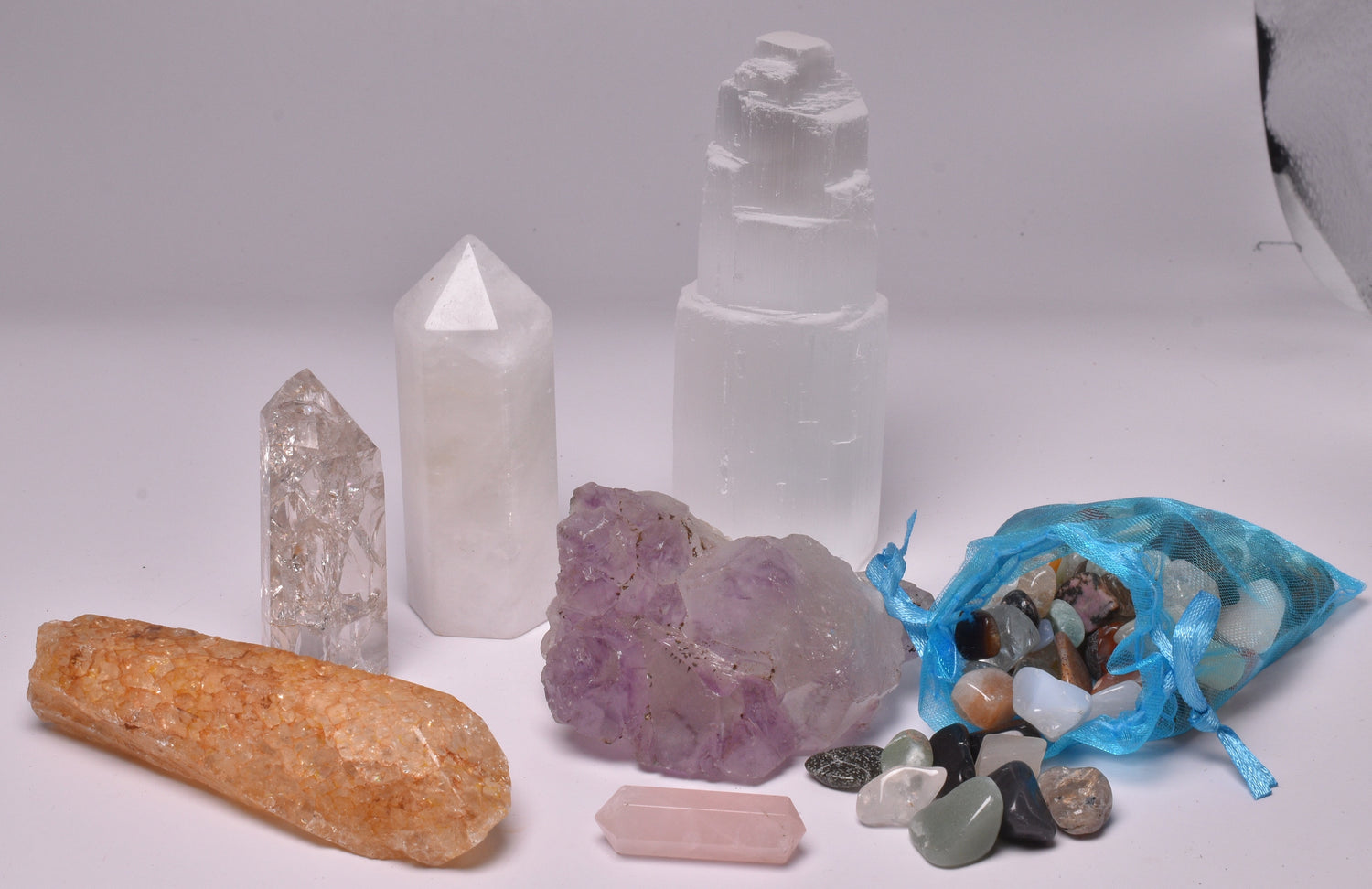 MIXED PACK, AMETHYST, SELENITE, FAIRY MIX, QUARTZ, ROSE QUARTZ, CRACKLED QUARTZ P494