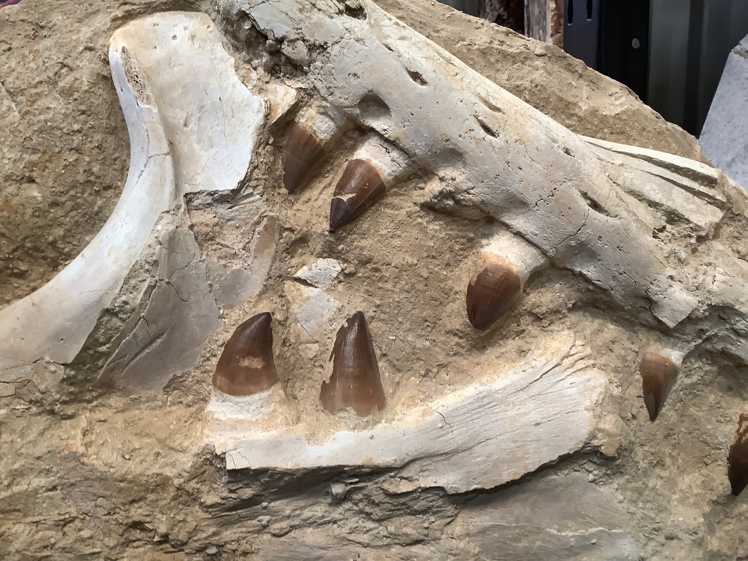 This Mosasaur anceps is still in the matrix and is from the early to late Cretaceous Period, and was discovered in Morocco.