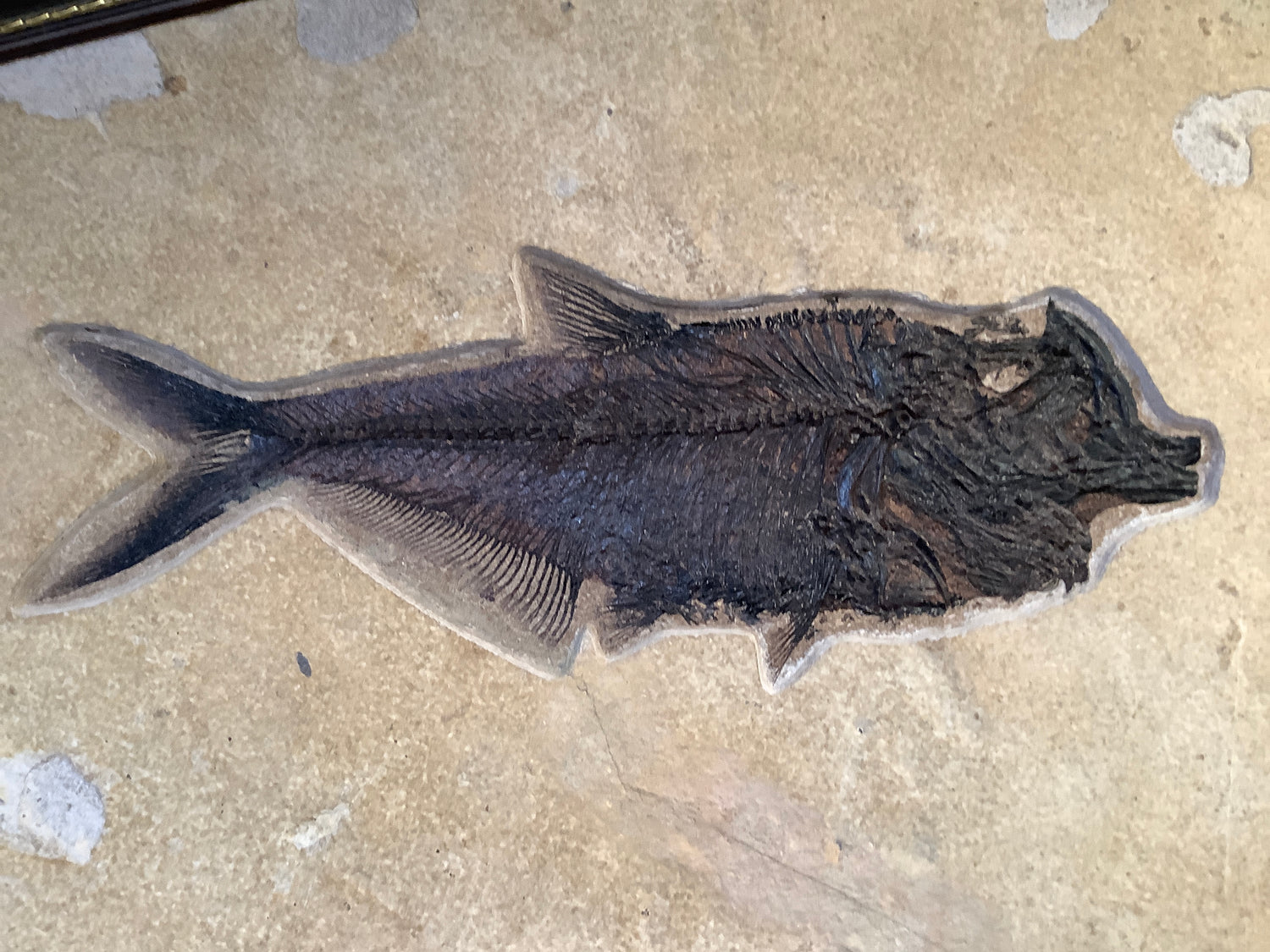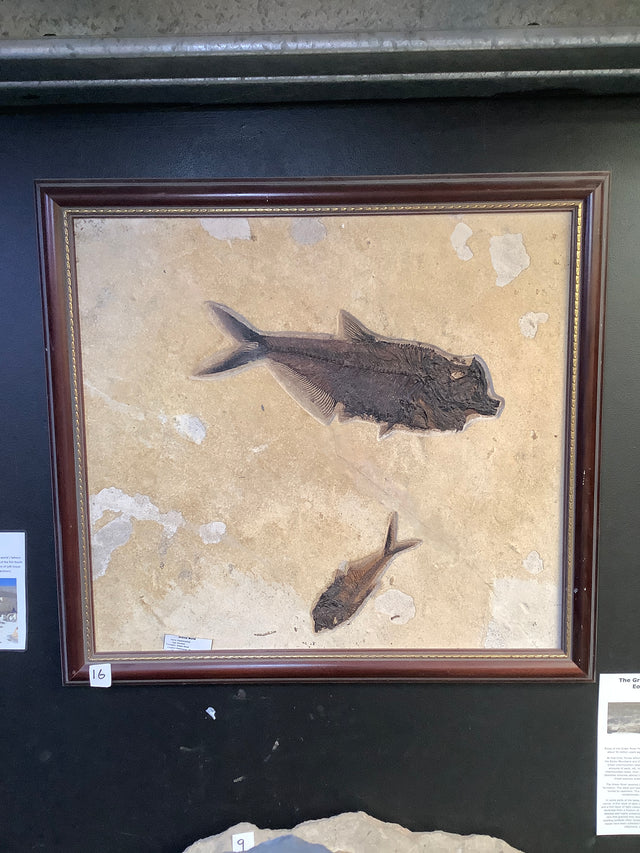 This framed fossil fish plate contains a Diplomystus dentatus and a Knightia alta. This fossil fish plate is from the Eocene Era, found at the Green River Formation in Wyoming, USA.