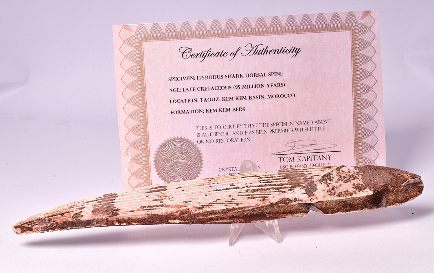 Delve into the prehistoric world with this Hybodus Shark Dorsal Spine Fossil, a genuine piece of natural history. Sourced from the phosphates of Morocco, this fossil dates back to the Late Cretaceous period, offering a tangible connection to the ancient oceans that once blanketed the earth. Each piece is a unique window into the past, revealing the intricate structure of a long-extinct shark species.