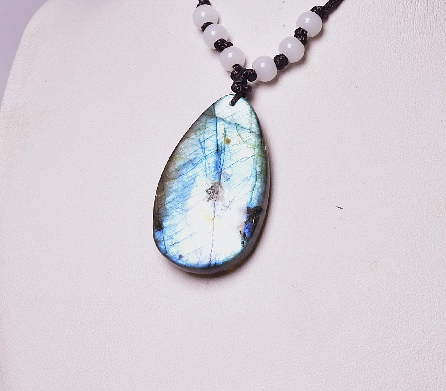 Set on macramé string with beads, slips over head and tightens or can leave it longer.